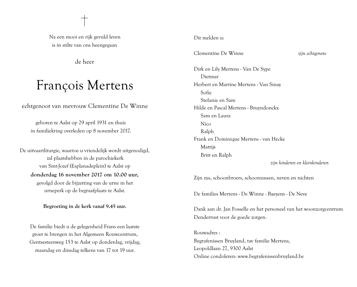 Overleden te Aalst (9300) op woensdag 8 november 2017 op 86-jarige leeftijd