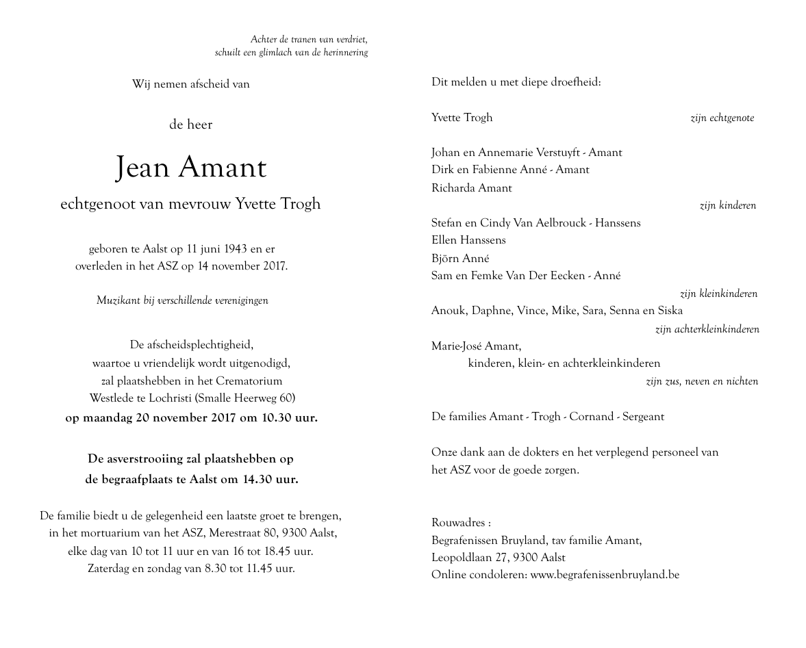 Overleden te Aalst (9300) op dinsdag 14 november 2017 op 74-jarige leeftijd