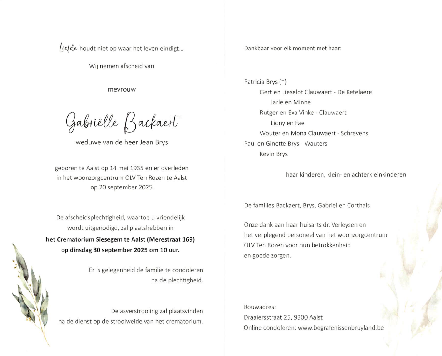 Overleden te Aalst (9300) op zaterdag 20 september 2025 op 90-jarige leeftijd