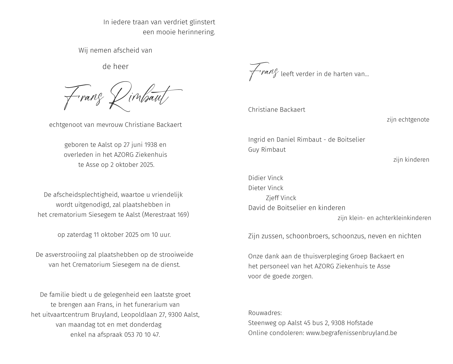 Overleden te Asse (1730) op donderdag 2 oktober 2025 op 87-jarige leeftijd
