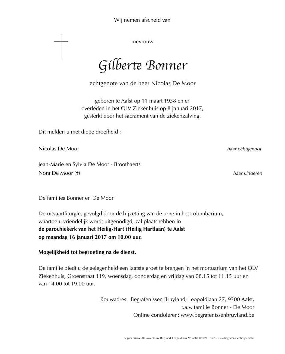 Overleden te Aalst (9300) op zondag 8 januari 2017 op 78-jarige leeftijd
