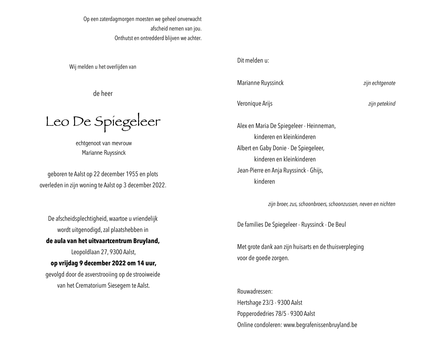 Overleden te Aalst (9300) op zaterdag 3 december 2022 op 66-jarige leeftijd