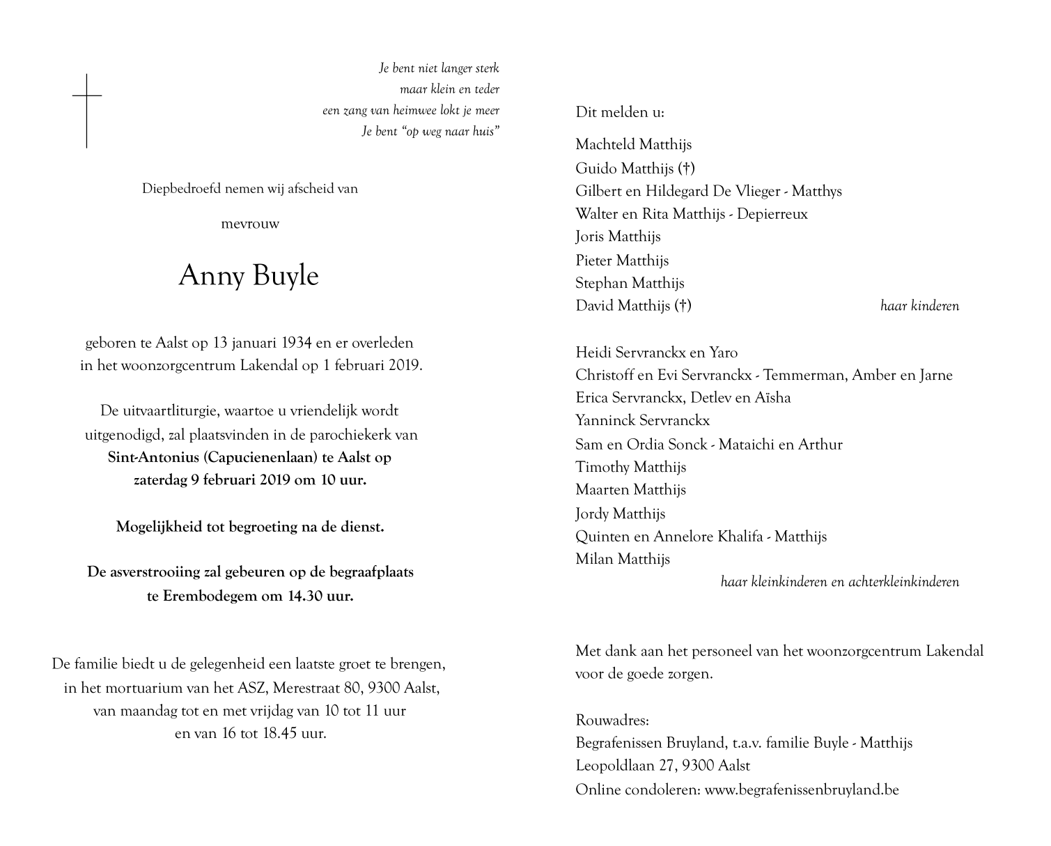Overleden te Aalst (9300) op vrijdag 1 februari 2019 op 85-jarige leeftijd