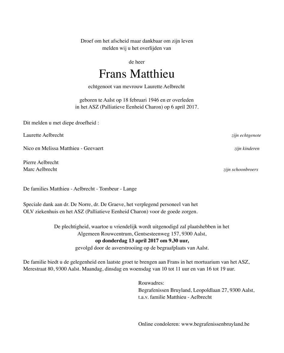 Overleden te Aalst (9300) op donderdag 6 april 2017 op 71-jarige leeftijd