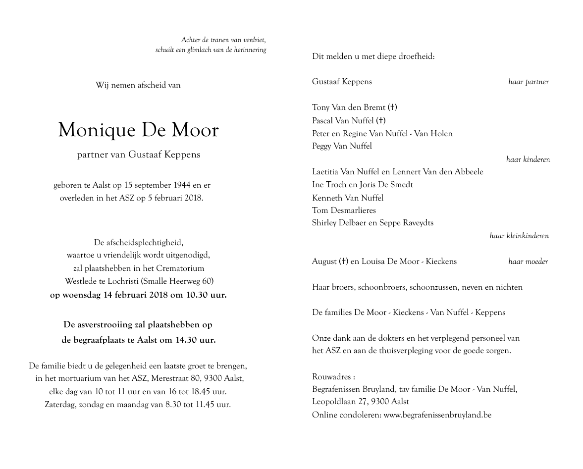 Overleden te Aalst (9300) op maandag 5 februari 2018 op 73-jarige leeftijd