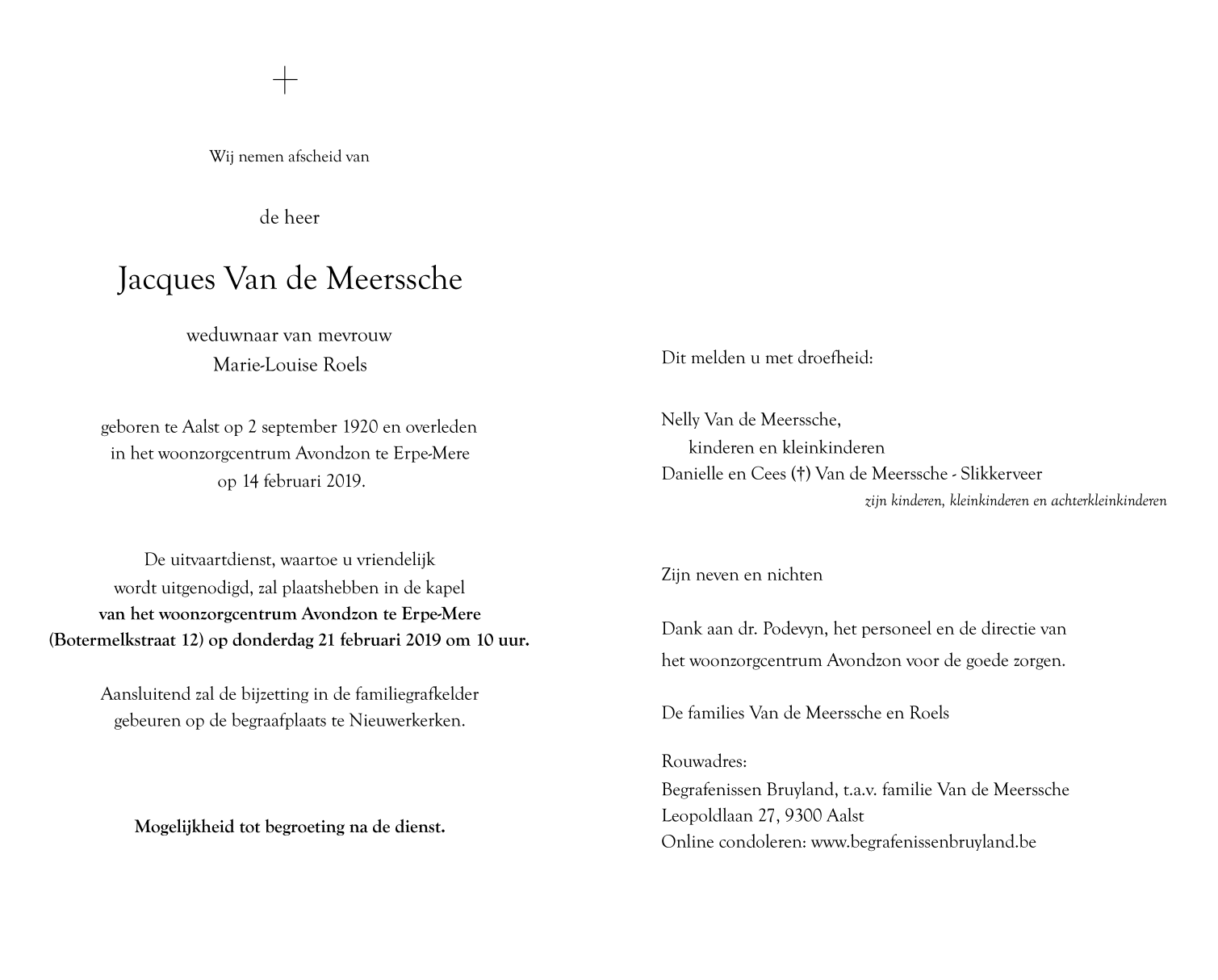 Overleden te Erpe-Mere (9420) op donderdag 14 februari 2019 op 98-jarige leeftijd