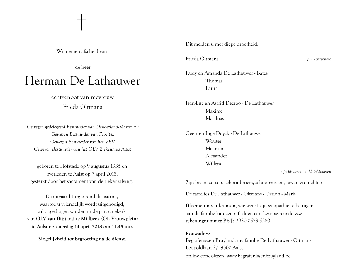 Overleden te Aalst (9300) op zaterdag 7 april 2018 op 82-jarige leeftijd