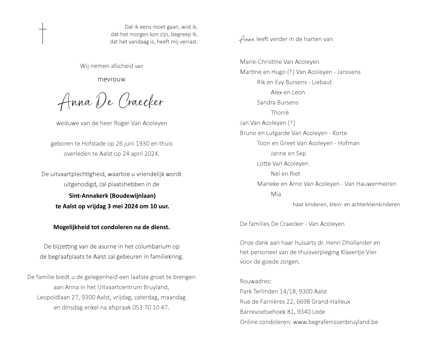 Overleden te Aalst (9300) op woensdag 24 april 2024 op 93-jarige leeftijd