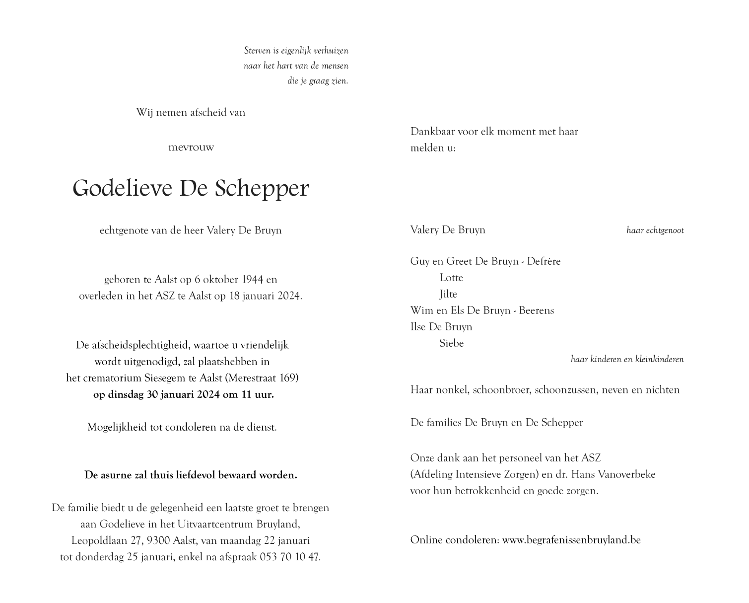 Overleden te Aalst (9300) op donderdag 18 januari 2024 op 79-jarige leeftijd