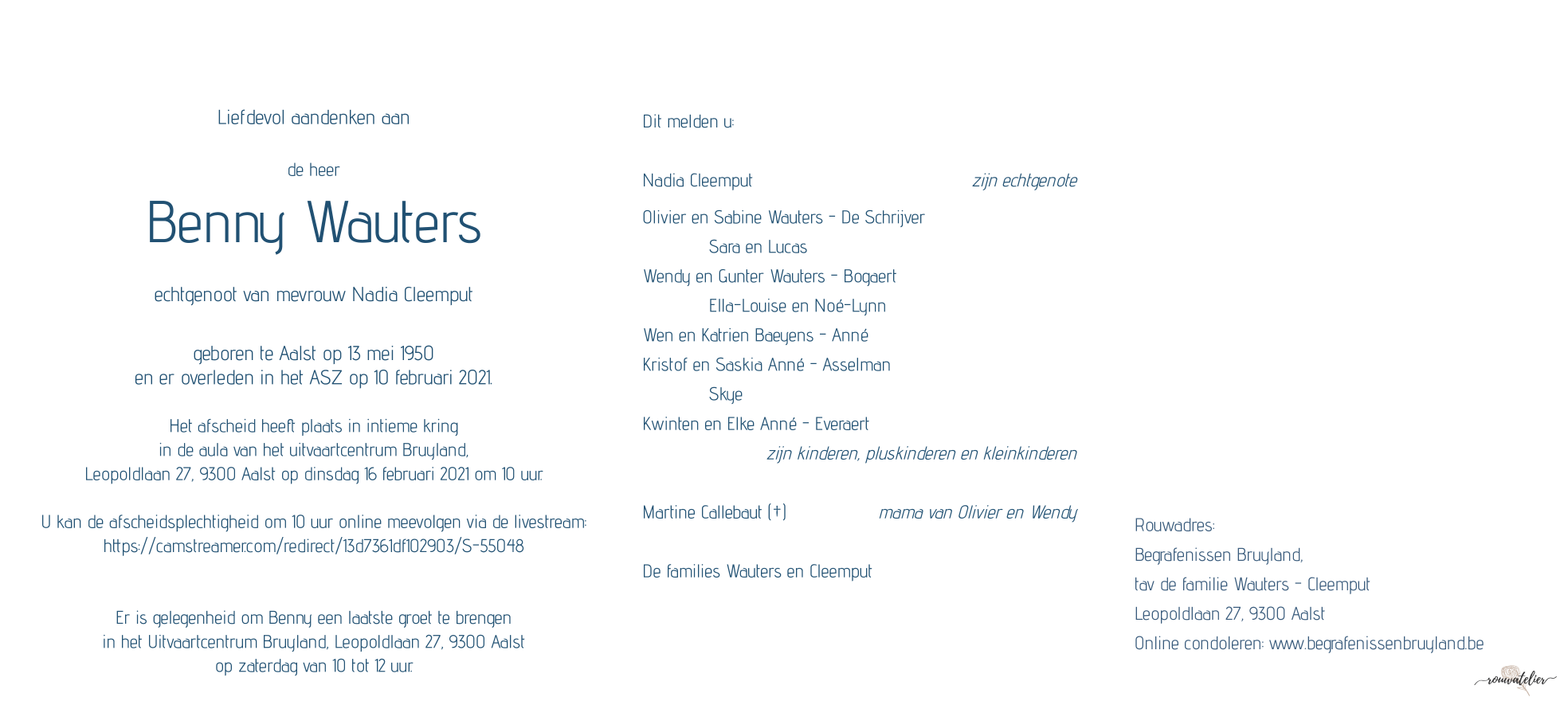 Overleden te Aalst (9300) op woensdag 10 februari 2021 op 70-jarige leeftijd