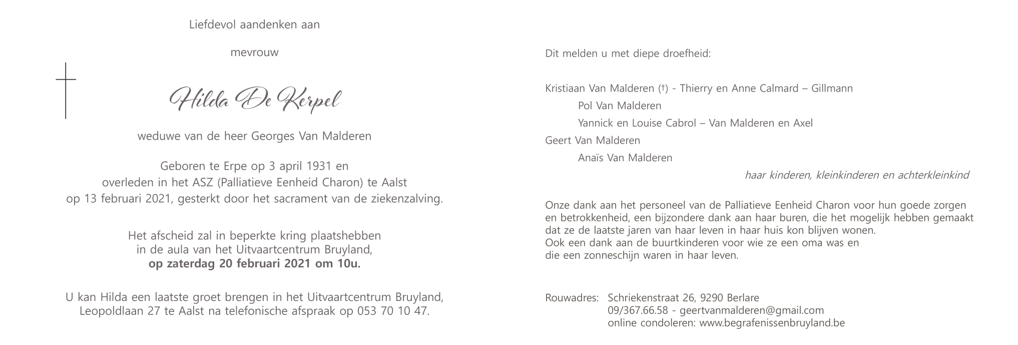 Overleden te Aalst (9300) op zaterdag 13 februari 2021 op 89-jarige leeftijd