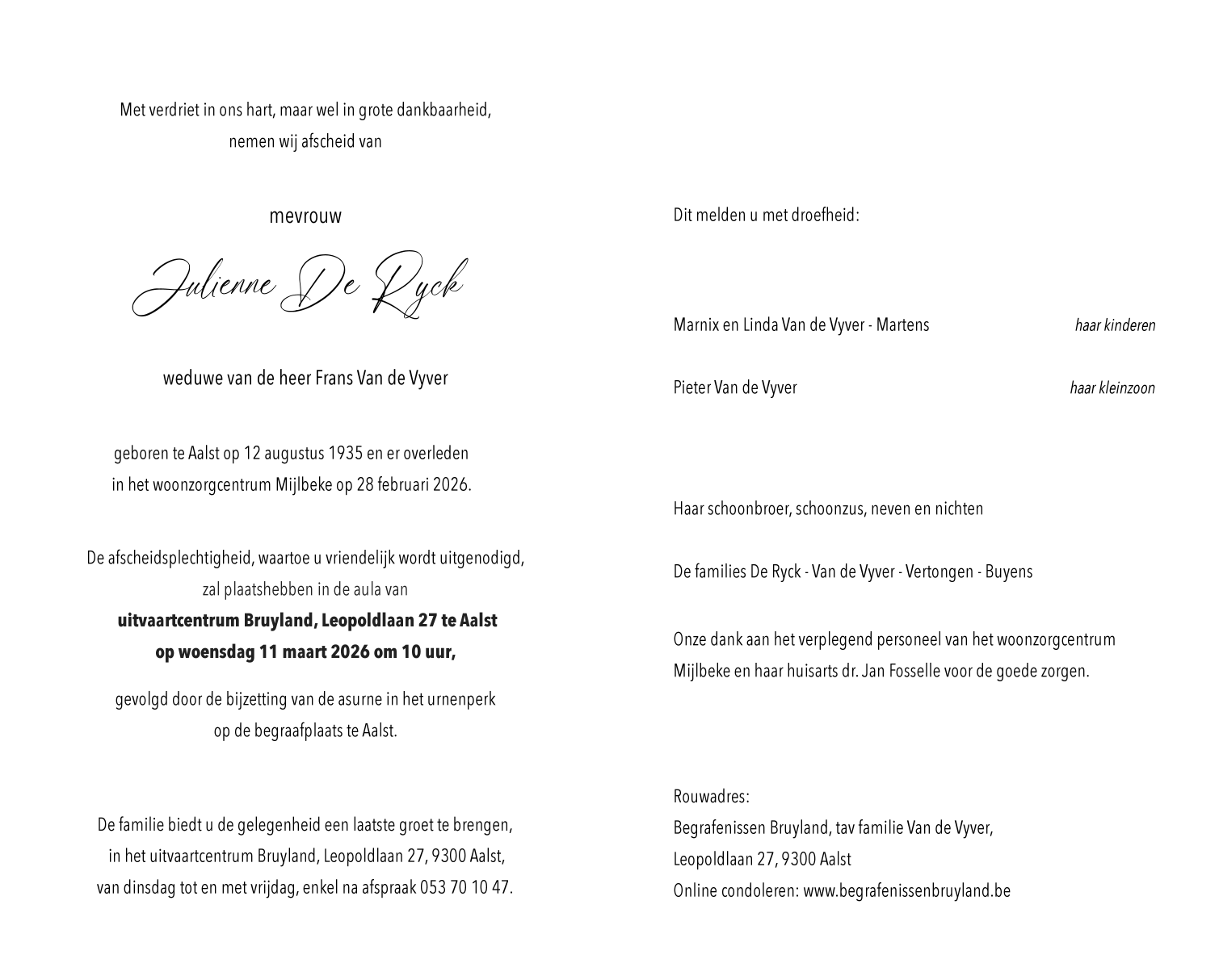 Overleden te Aalst (9300) op zaterdag 28 februari 2026 op 90-jarige leeftijd