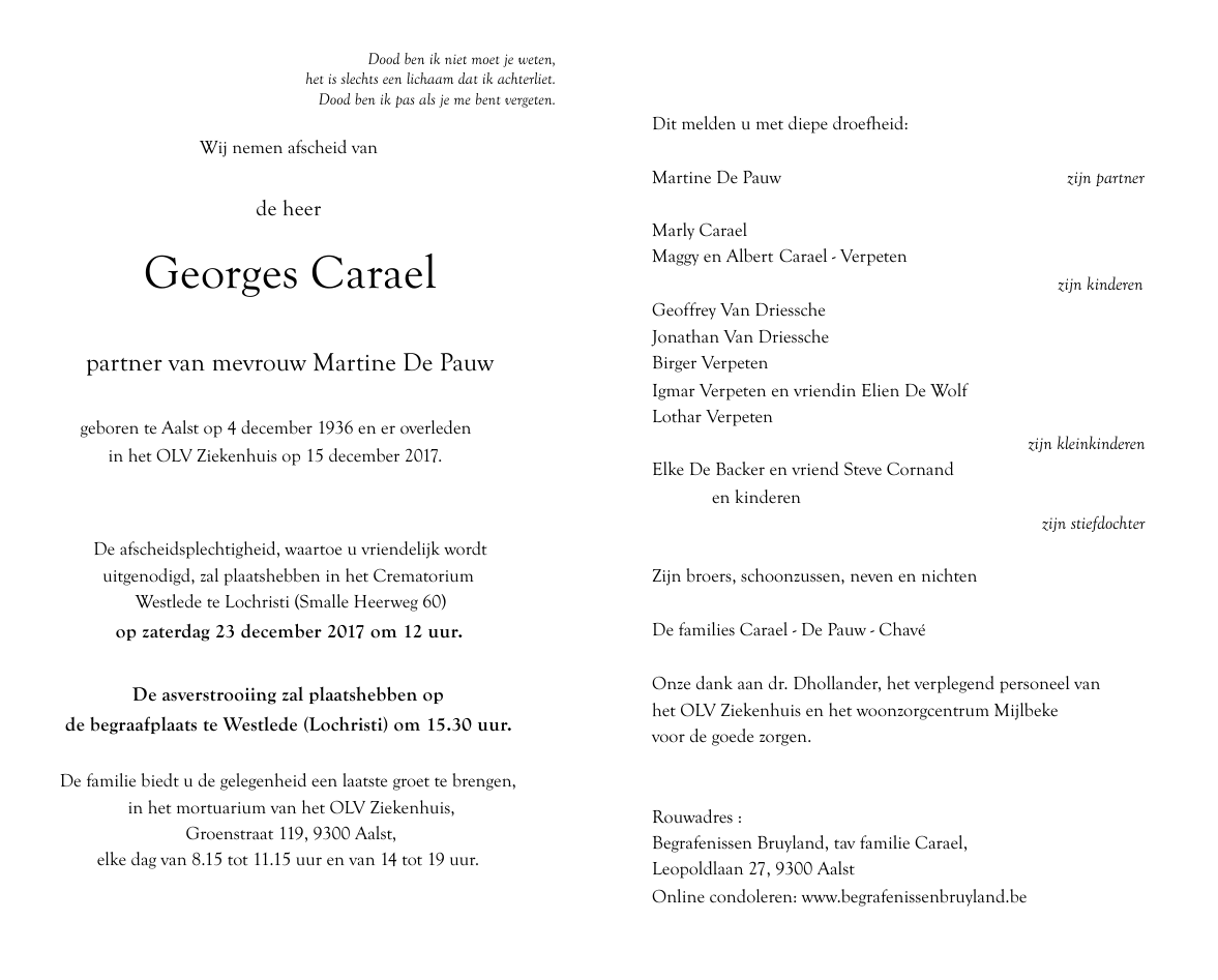 Overleden te Aalst (9300) op vrijdag 15 december 2017 op 81-jarige leeftijd
