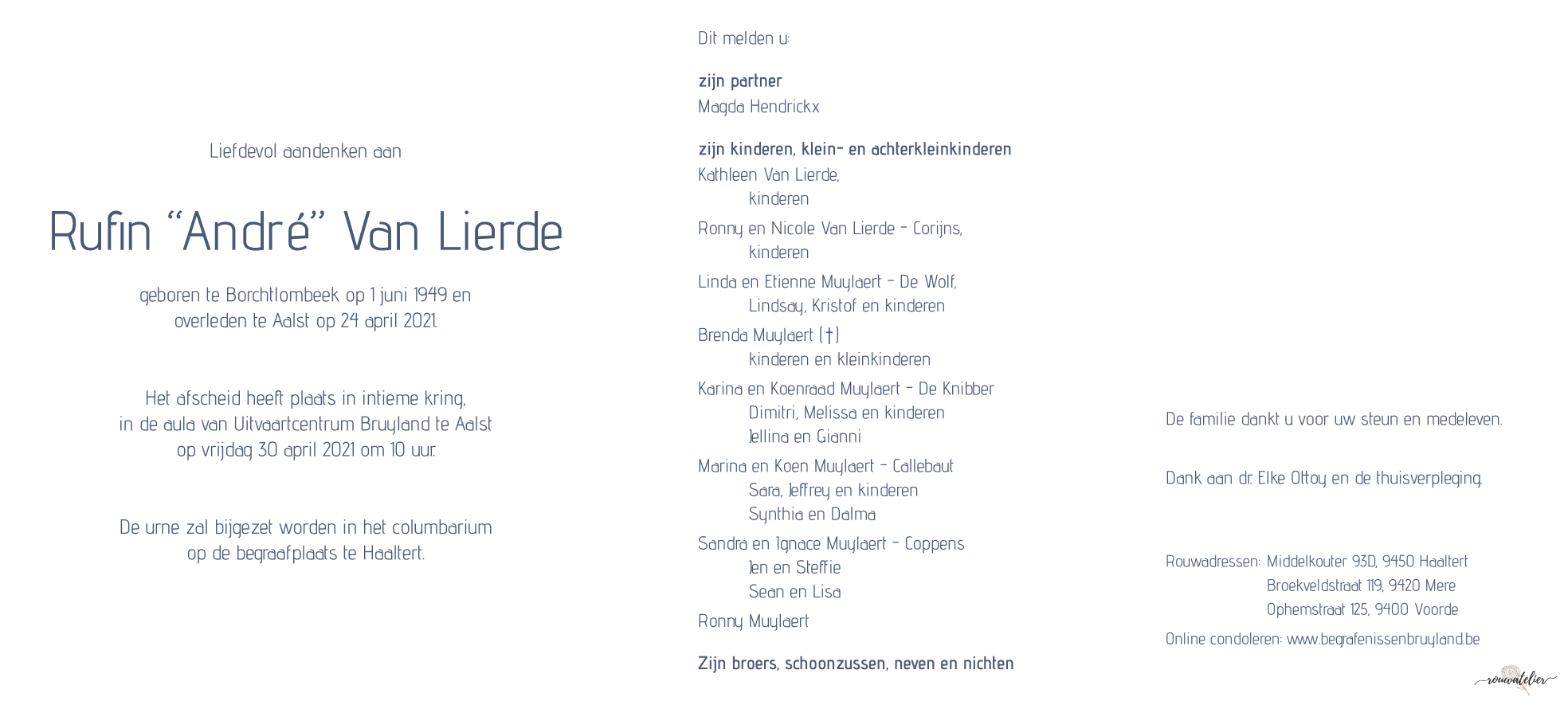 Overleden te Aalst (9300) op zaterdag 24 april 2021 op 71-jarige leeftijd