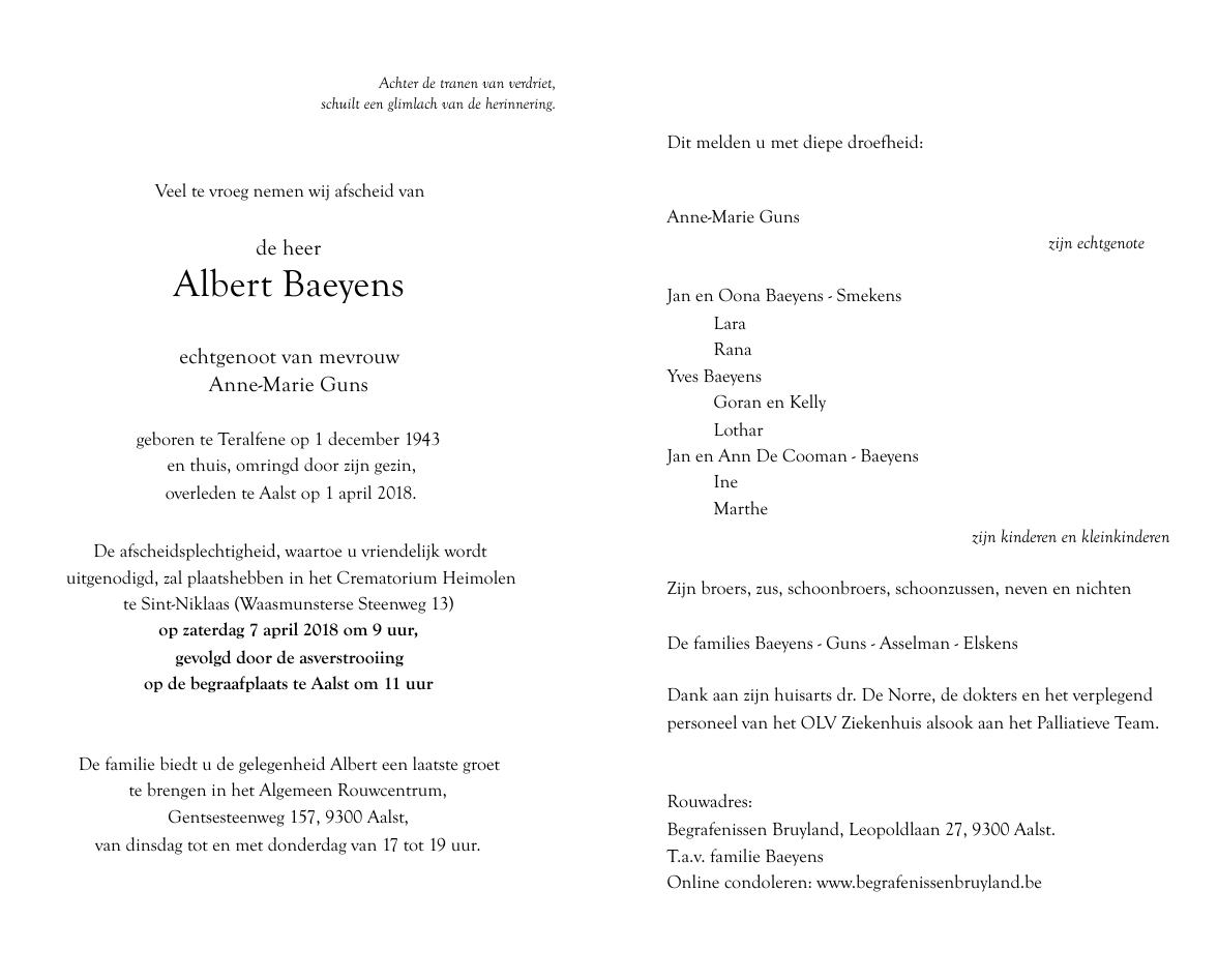 Overleden te Aalst (9300) op zondag 1 april 2018 op 74-jarige leeftijd