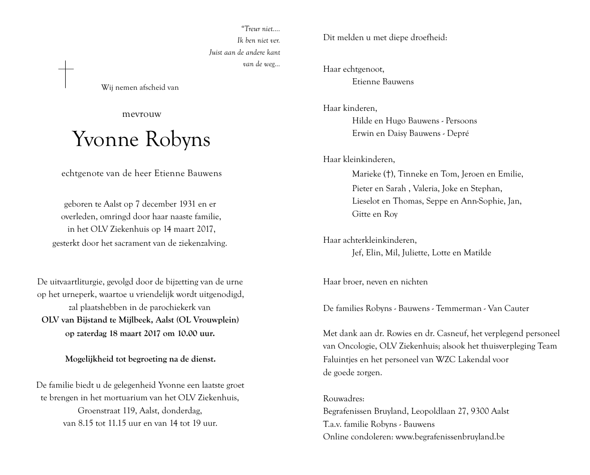 Overleden te Aalst (9300) op dinsdag 14 maart 2017 op 85-jarige leeftijd