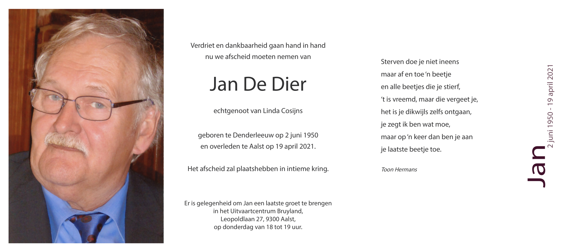 Overleden te Aalst (9300) op maandag 19 april 2021 op 70-jarige leeftijd