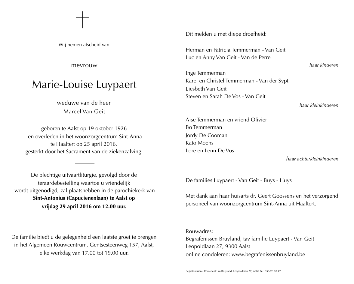 Overleden te Haaltert (9450) op maandag 25 april 2016 op 89-jarige leeftijd