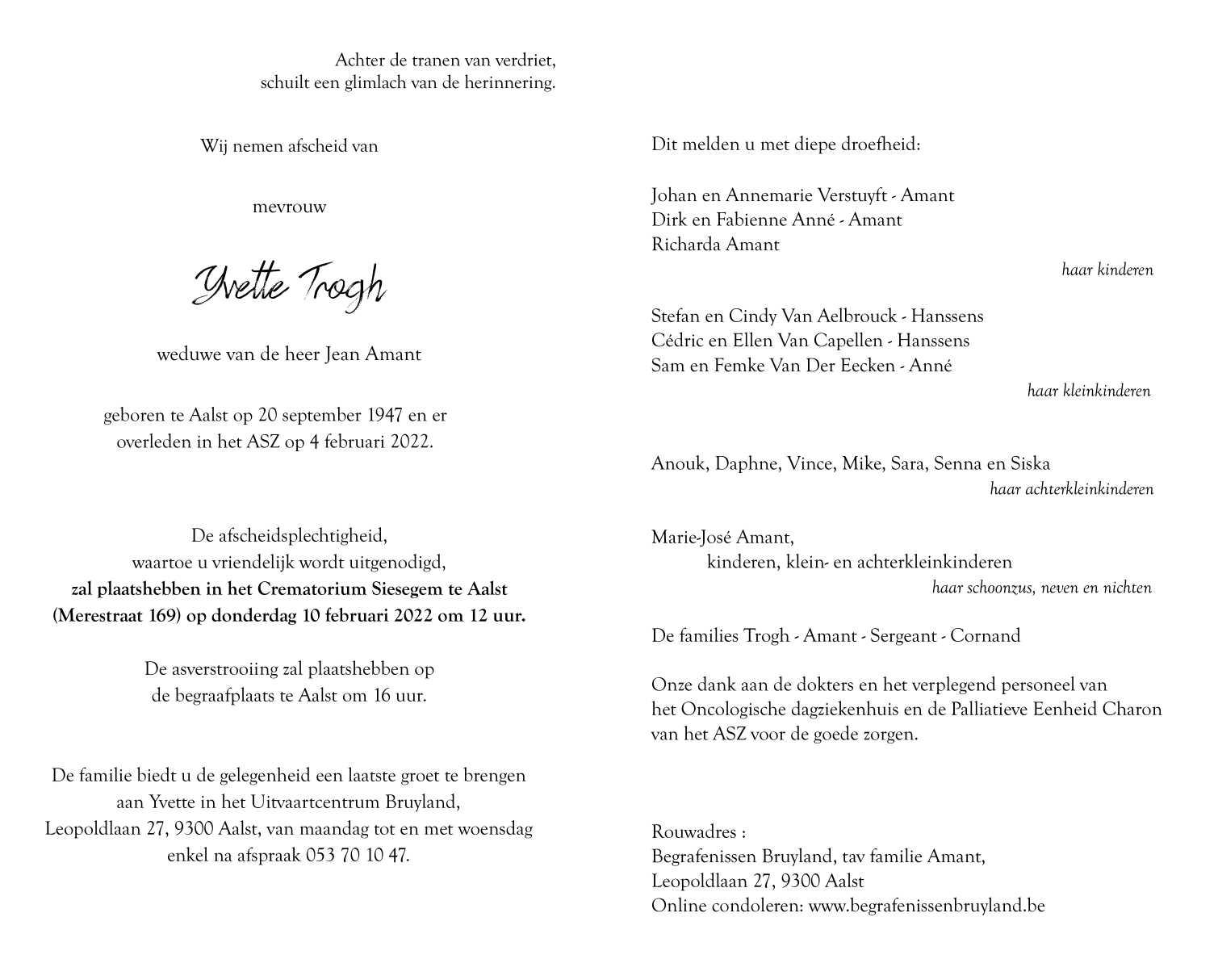 Overleden te Aalst (9300) op vrijdag 4 februari 2022 op 74-jarige leeftijd