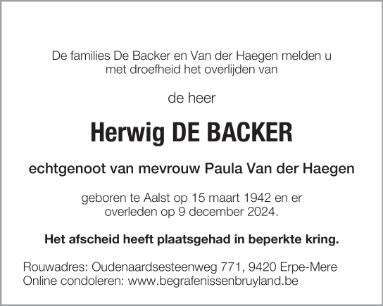 Overleden te Aalst (9300) op maandag 9 december 2024 op 82-jarige leeftijd