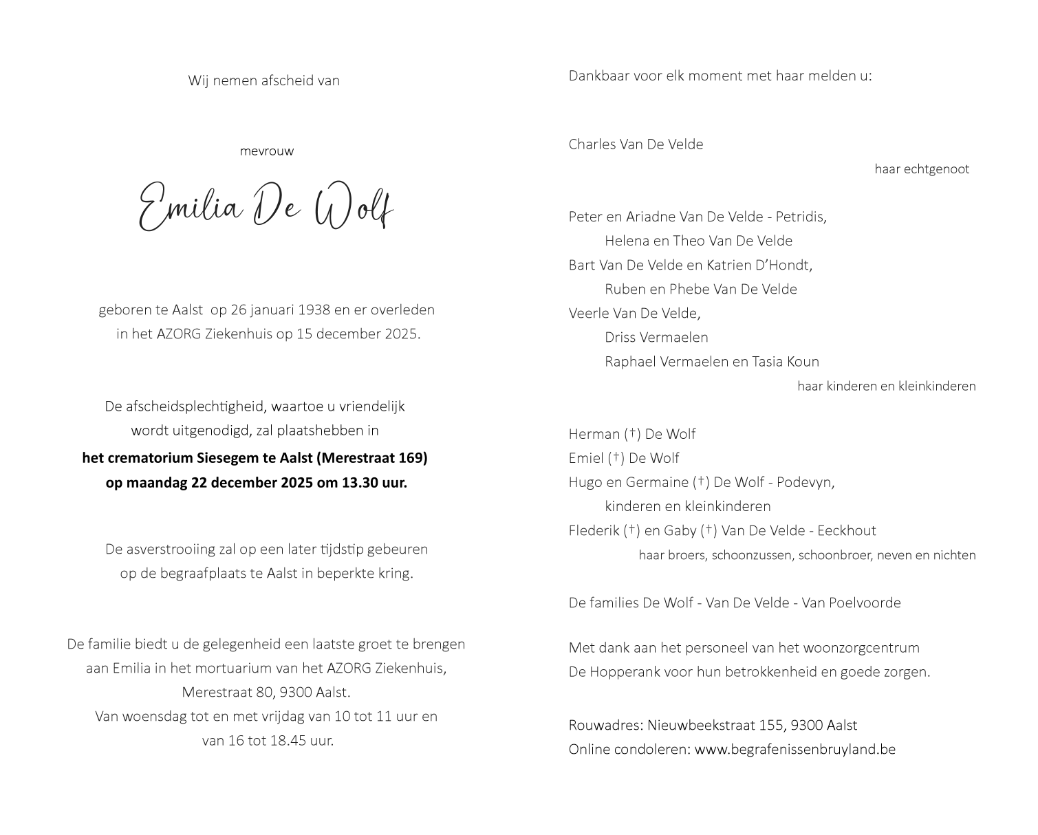 Overleden te Aalst (9300) op maandag 15 december 2025 op 87-jarige leeftijd
