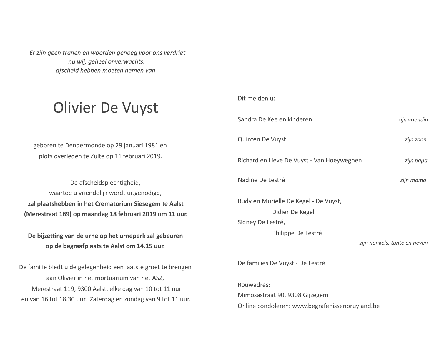 Overleden te Zulte (9870) op maandag 11 februari 2019 op 38-jarige leeftijd